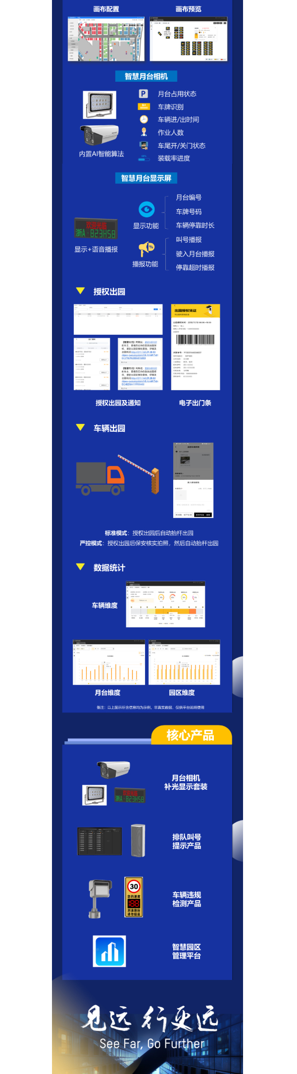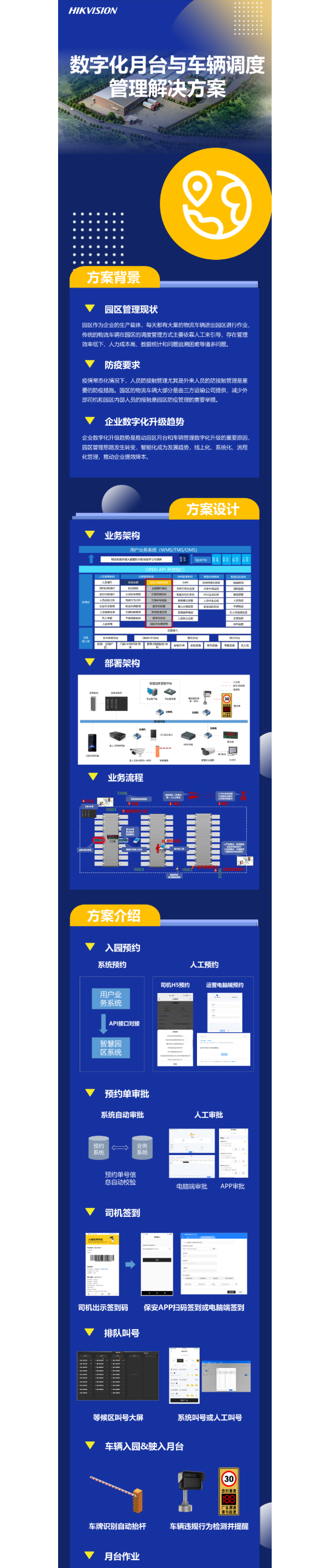 覆蓋園區(qū)門崗、月臺、單證室等作業(yè)場景,實現(xiàn)園區(qū)物流車輛預(yù)約、審批、排隊、叫號、入園、月臺作業(yè)及授權(quán)出園等全鏈路的線上化數(shù)字化智能化管理,提效降本。